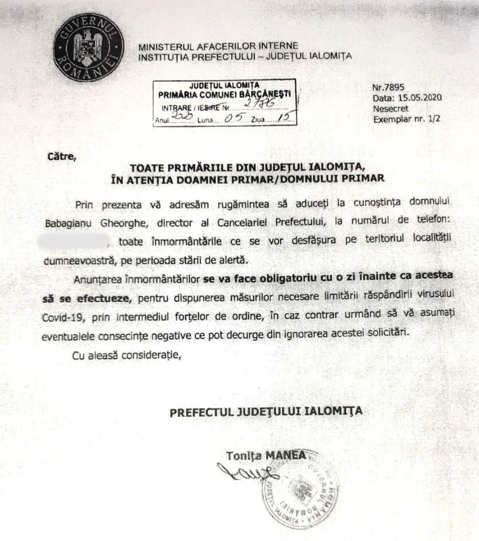 Instituția Prefectului Ialomița a trimis primarilor din județ o adresă prin care le pune în vedere că au obligativitatea de a anunța din vreme orice înhumare.